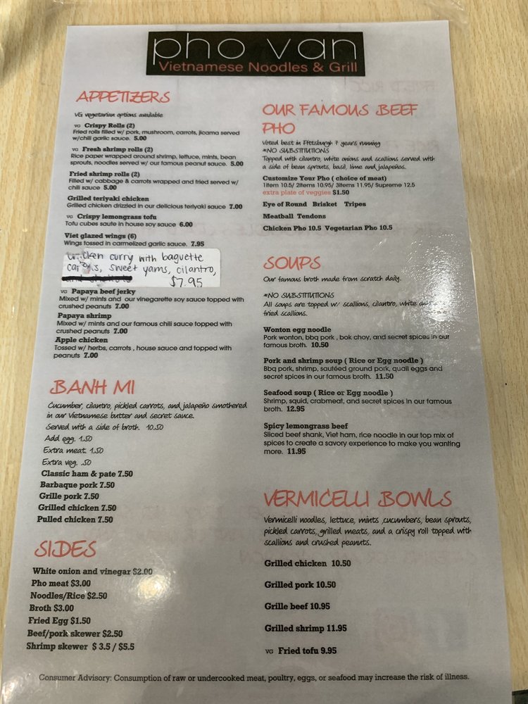 For those seeking lighter fare, the vermicelli bowls, featuring options from grilled chicken to fried tofu, are perfect. With vegan options available and a welcoming atmosphere, Pho Van is great for families and groups. Enjoy takeout or dine in while taking advantage of outdoor seating. Plus, their happy hour specials ensure you can indulge without breaking the bank. Experience the vibrant flavors and warm hospitality that have made Pho Van a beloved spot in Pittsburgh!